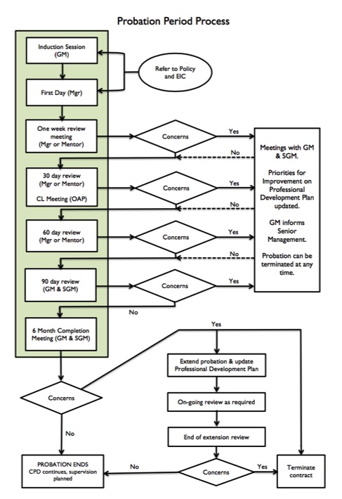 42.11 Further review meetings will be held on 30, 60 and 90 days of the person’s first 3 month working period. The 30 and 60 day meetings will be with the mentor, and manager if required. The Managing Director can attend any meetings as required but will attend the final meeting at the end of the probation period.