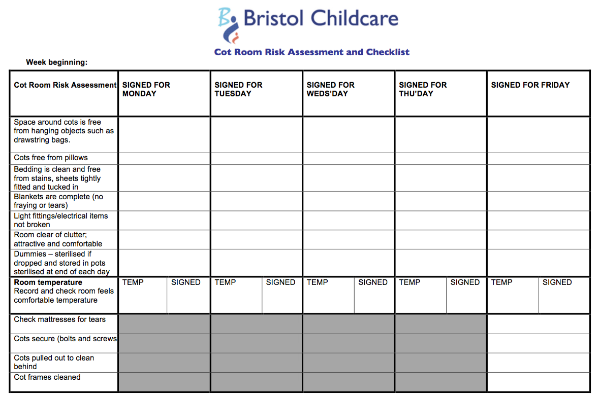 Sleeping at Nursery – Appendix 1 Cot Room Risk Assessment and Checklist Click to download printable document – Cot_room_risk_assessment (102kb)